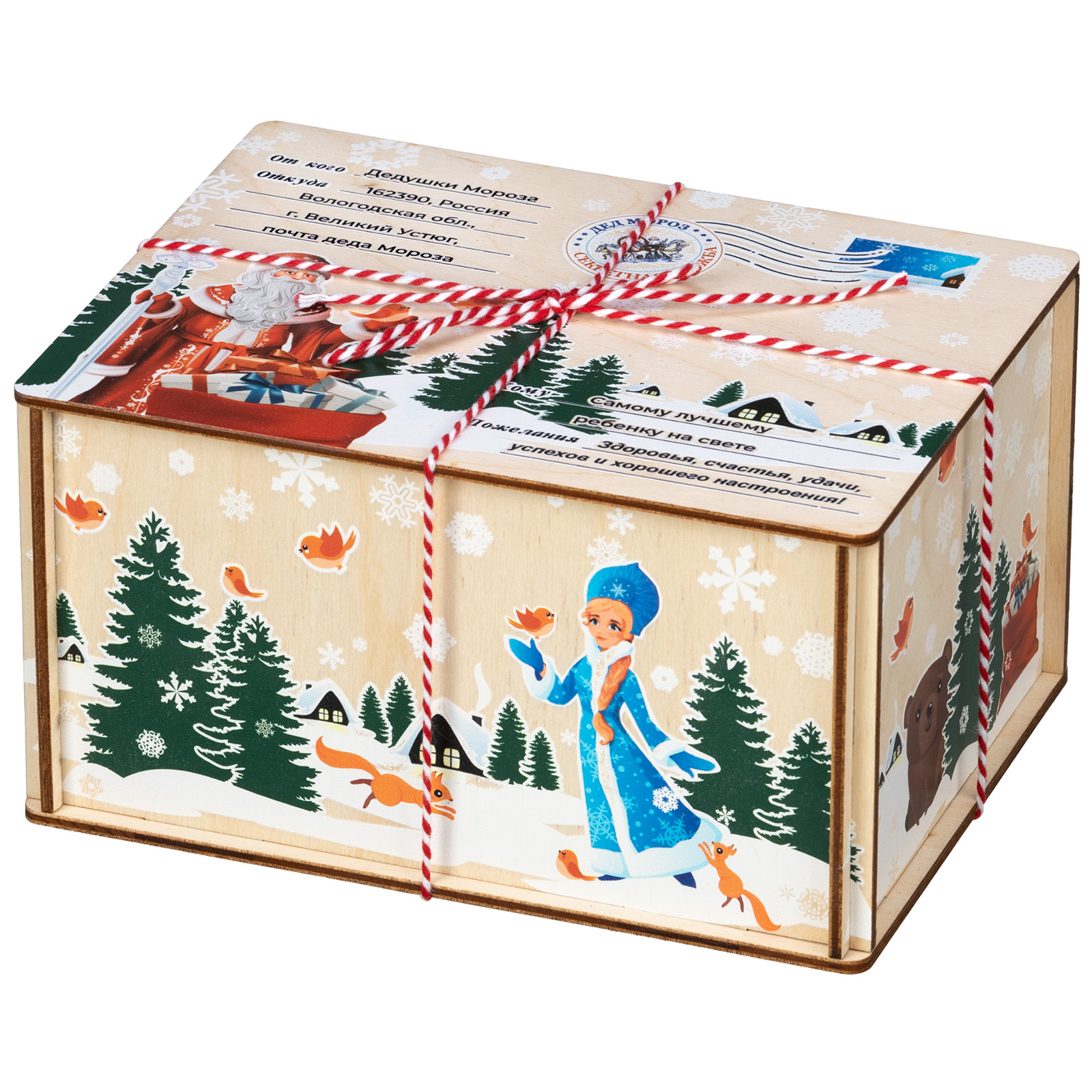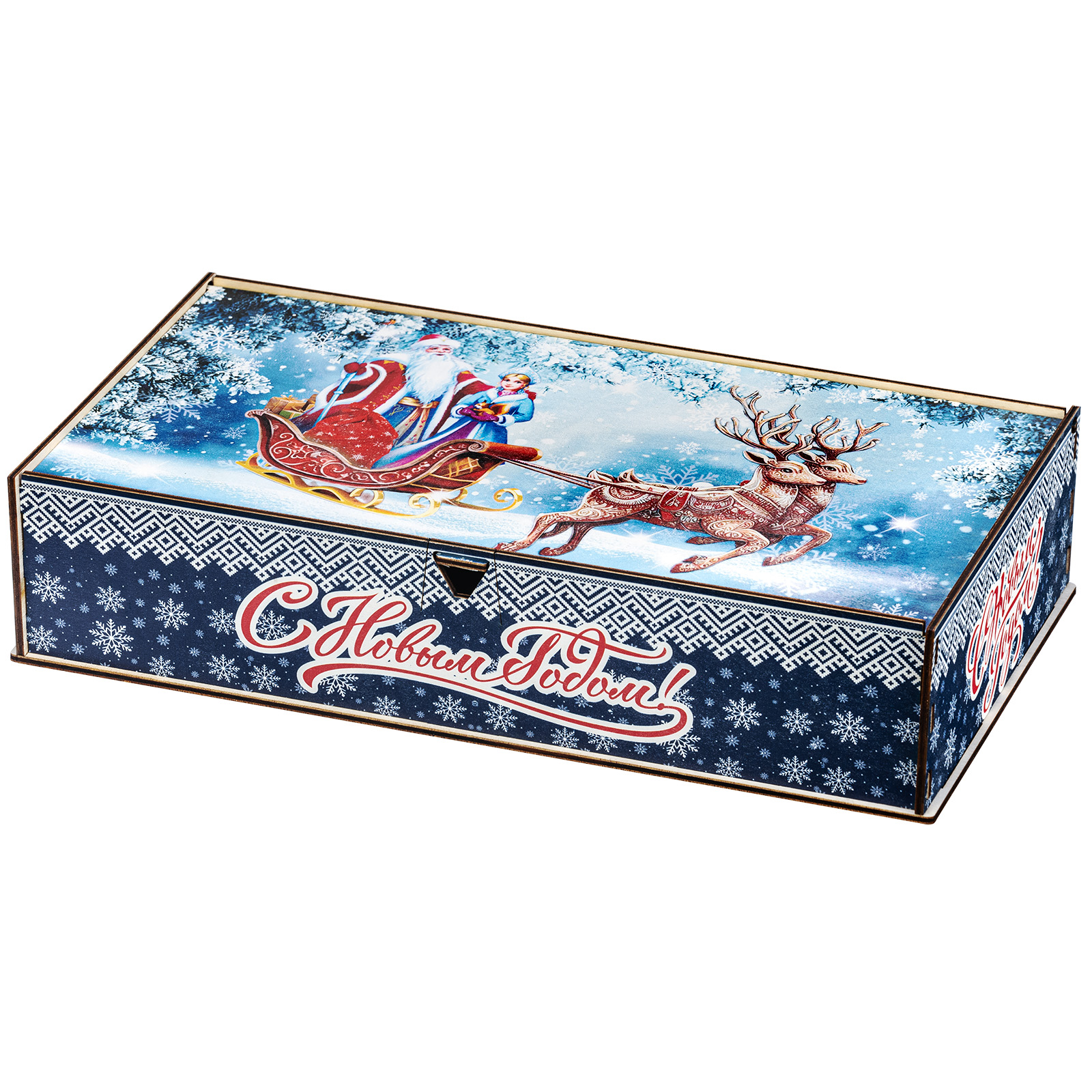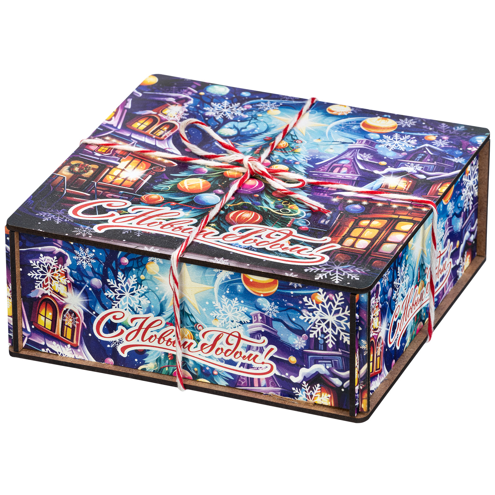 Деревянная упаковка изготавливается из прочной фанеры, поверхность которой декорируется принтами на новогоднюю тематику с помощью полноцветной печати. Сладкие наборы в таком оформлении можно преподнести не только детям, но и взрослым, например, коллегам или партнерам.