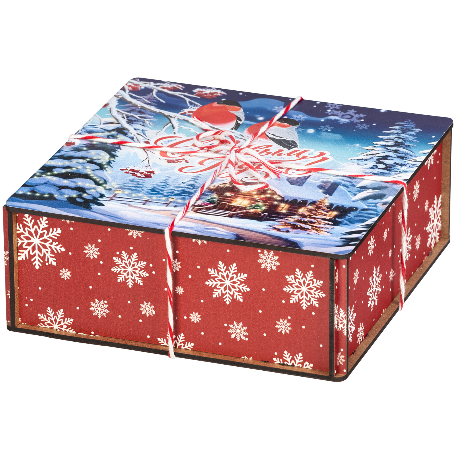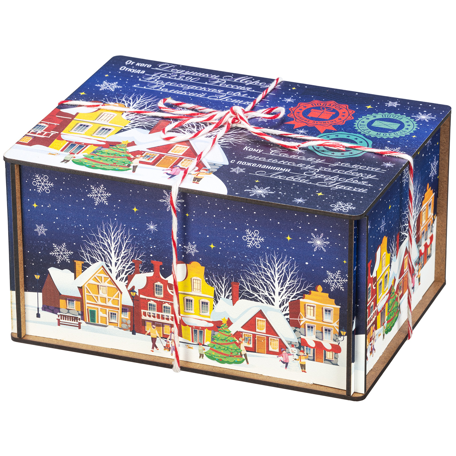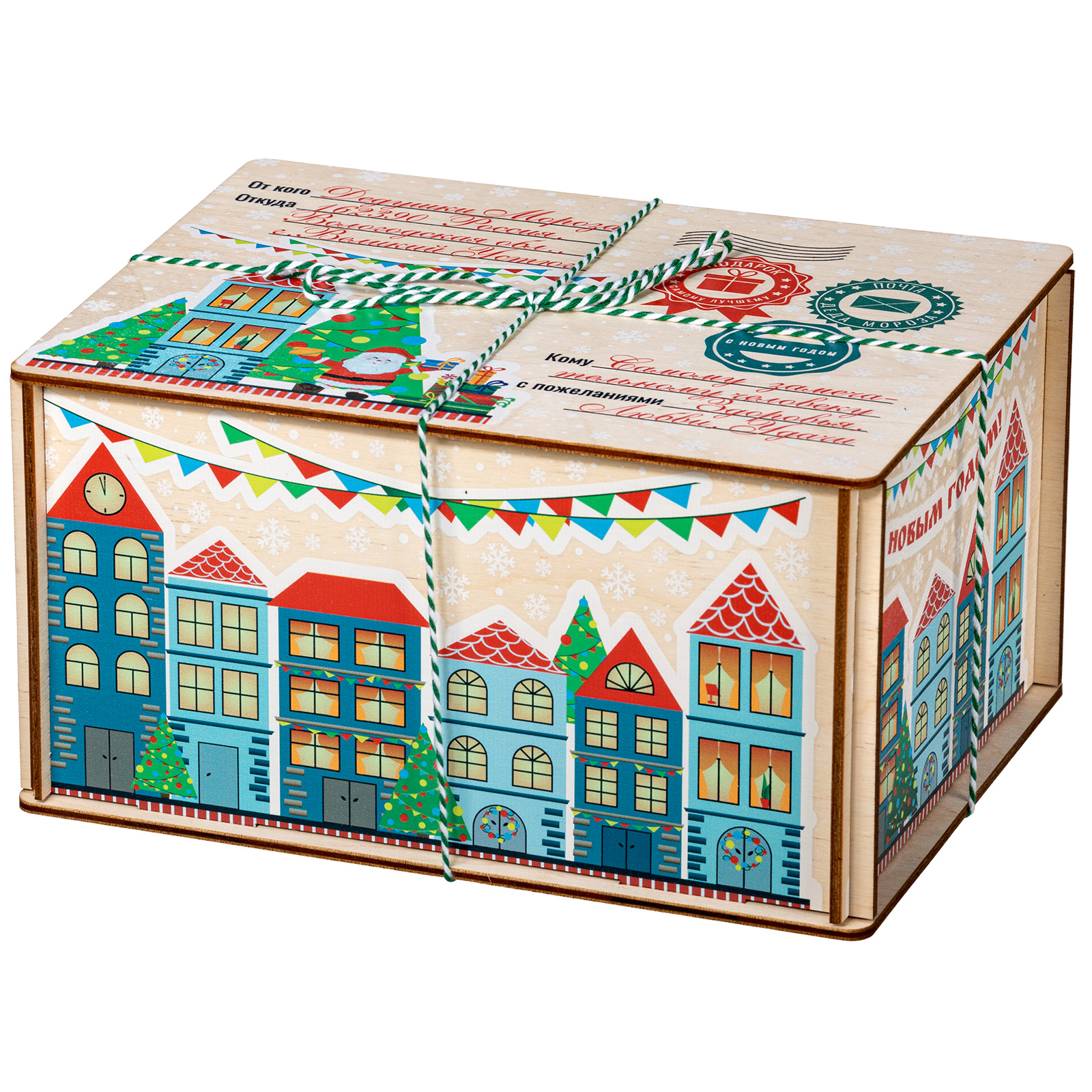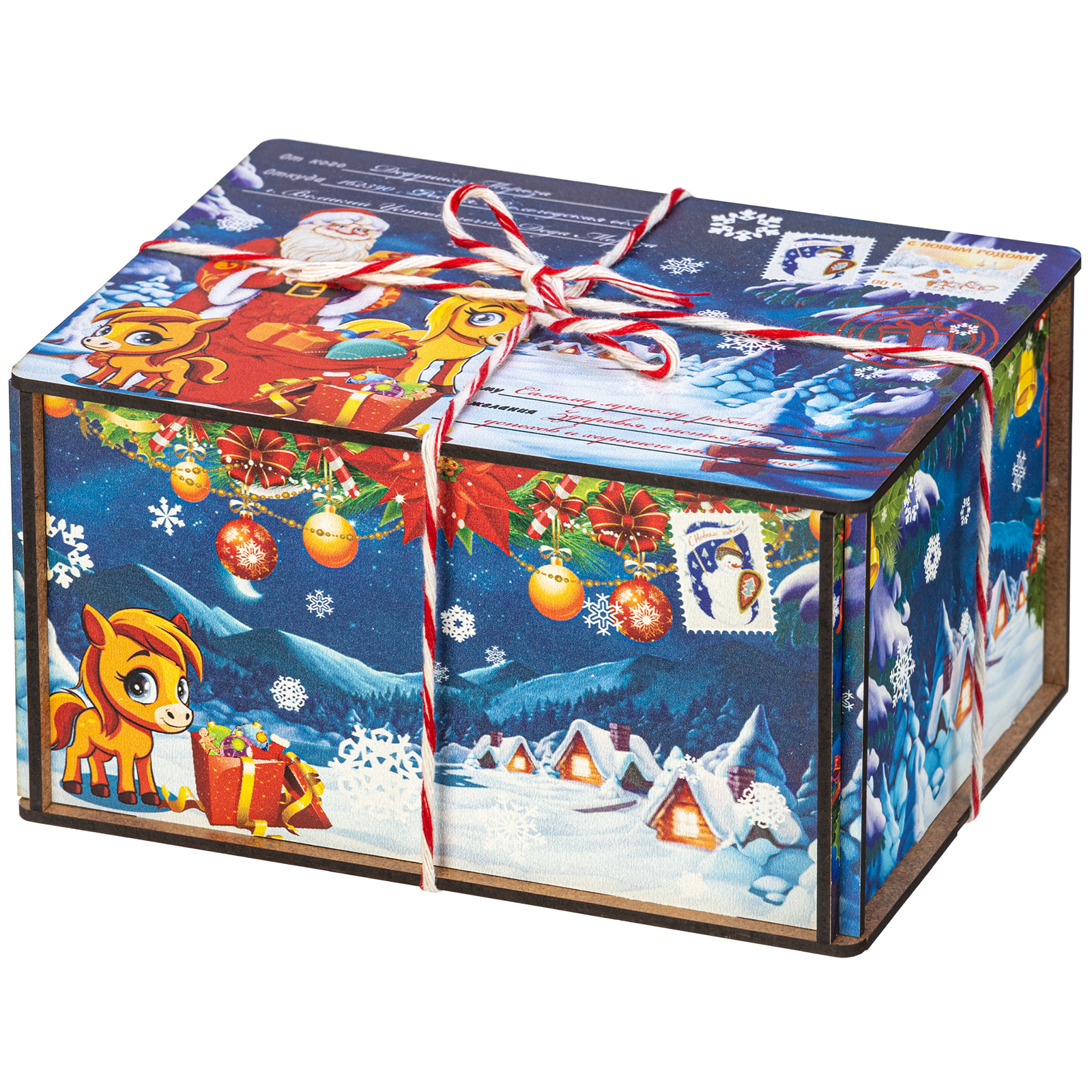 Деревянная упаковка изготавливается из прочной фанеры, поверхность которой декорируется принтами на новогоднюю тематику с помощью полноцветной печати. Сладкие наборы в таком оформлении можно преподнести не только детям, но и взрослым, например, коллегам или партнерам.