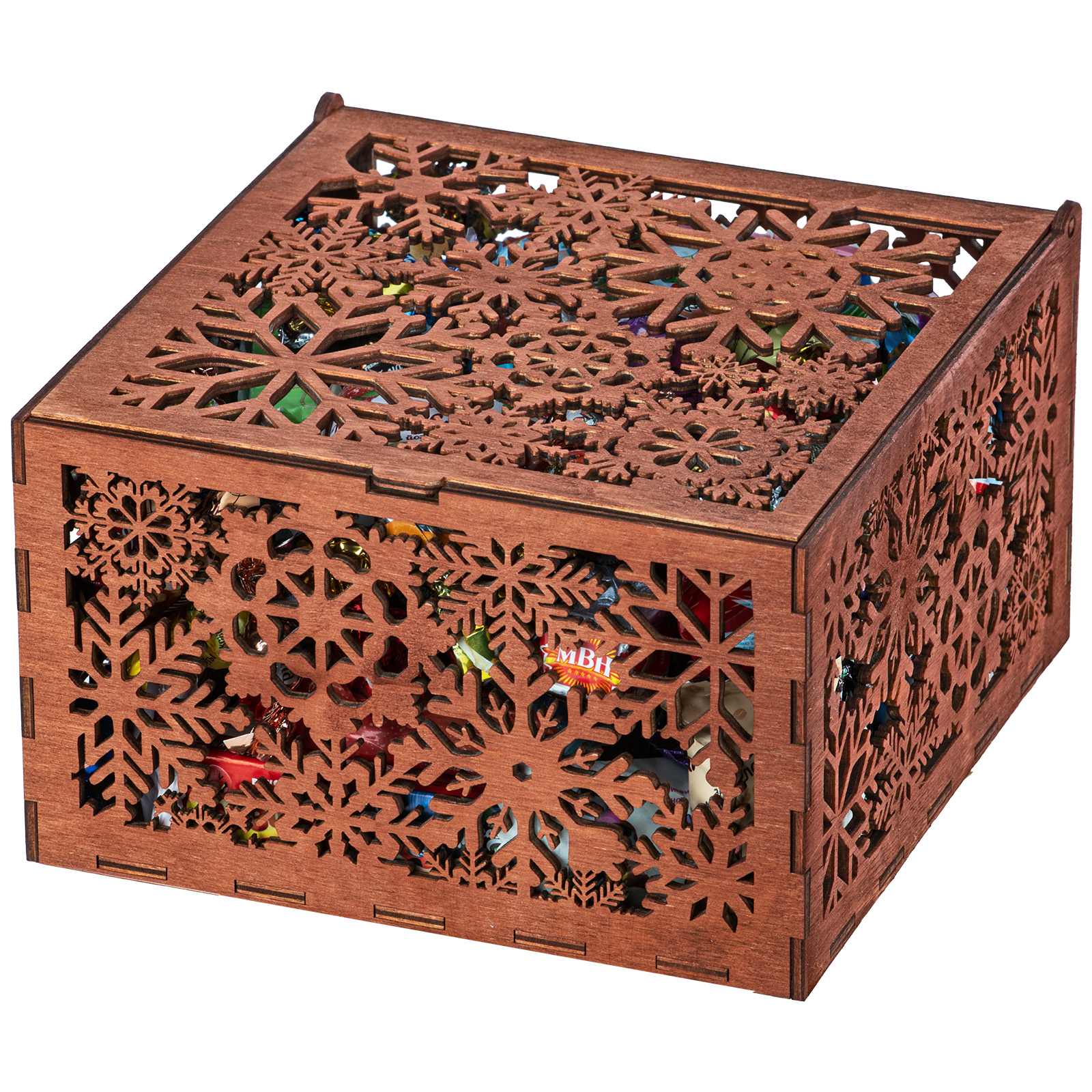 Внутри каждого подарка в деревянной упаковке – изделия крупнейших кондитерских концернов. Мы заботимся о том, чтобы сделать конфетное наполнение разнообразным, вкусным и угодить и маленьким сладкоежкам, и взрослой аудитории.
